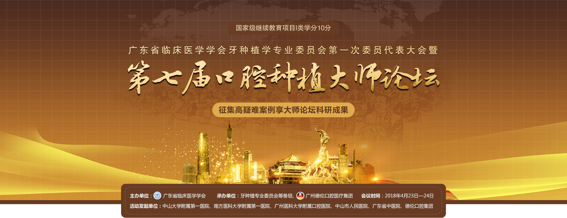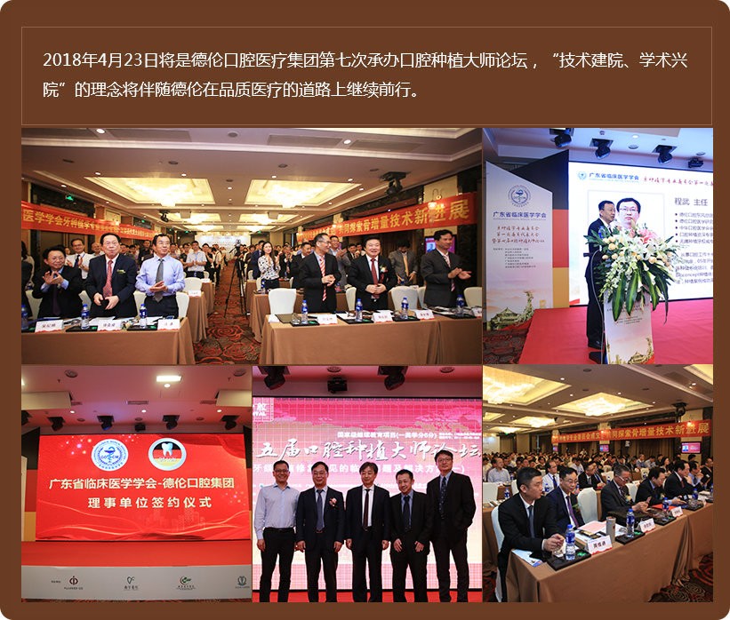 4月23、24日,由德伦口腔承办的第七届种植大师论坛隆重举行。来自中外30余位种植教授博士,口腔种植行业内巨擘、300位海内外种植 专家共聚羊城,就“牙种植骨增量技术的最新研究成果以及技术”进行学术讨论,交流授课。广州广播电视台《G4出动》、今日头条、大 粤网-腾讯、羊城晚报、广州日报等多家知名媒体汇聚现场,采访报道。当天,广东省临床医学学会与德伦口腔集团签约,德伦口腔正式成 为广东省临床医学学会理事单位。