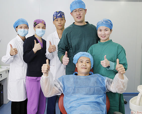 • 整个种植手术时长约1个小时,即刻负重(不仅恢复牙齿的美观功能、还能满足部分咀嚼功能)成功后,患者与医务人员合影,纪念牙齿重生的高兴时刻。